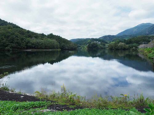 大野貯水池 ダムからの遠望 大野ダムはアースダムという型式のものらしい。堤高が37.3メートル、堤頂長309.1メートル、堤体積は352,000立方メートル、東京電力(株)のダムということだな。土木学会の選定で「日本の近代土木遺産~現存する重要な土木構造物2…